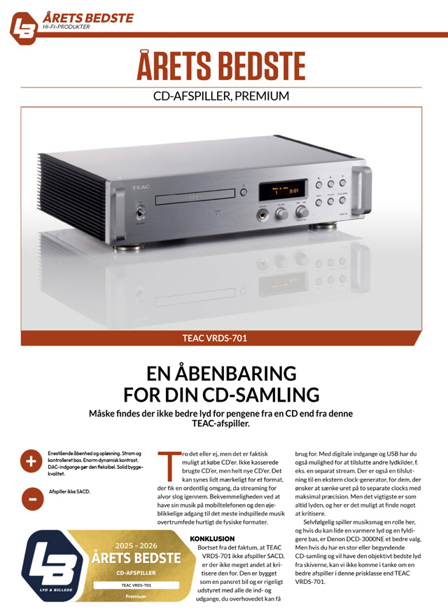 このたびVRDS-701が、北欧で最も影響力のあるAVメディアの一つLyd & Billede(リッド&ビレデ)による「Årets Bedste 2025–2026」プレミアムCDプレーヤー部門のベスト・オブ・ザ・イヤーを受賞いたしました。